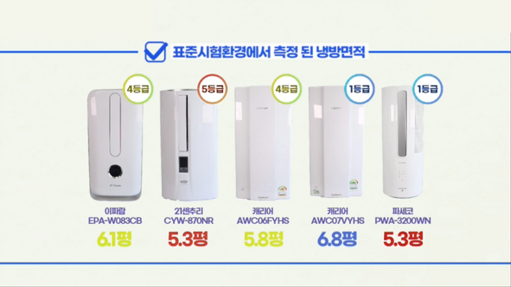 제품 5종의 평균 냉방 면적은 5~7평 정도로, 캐리어 1등급이 6.8평으로 제일 넓고,