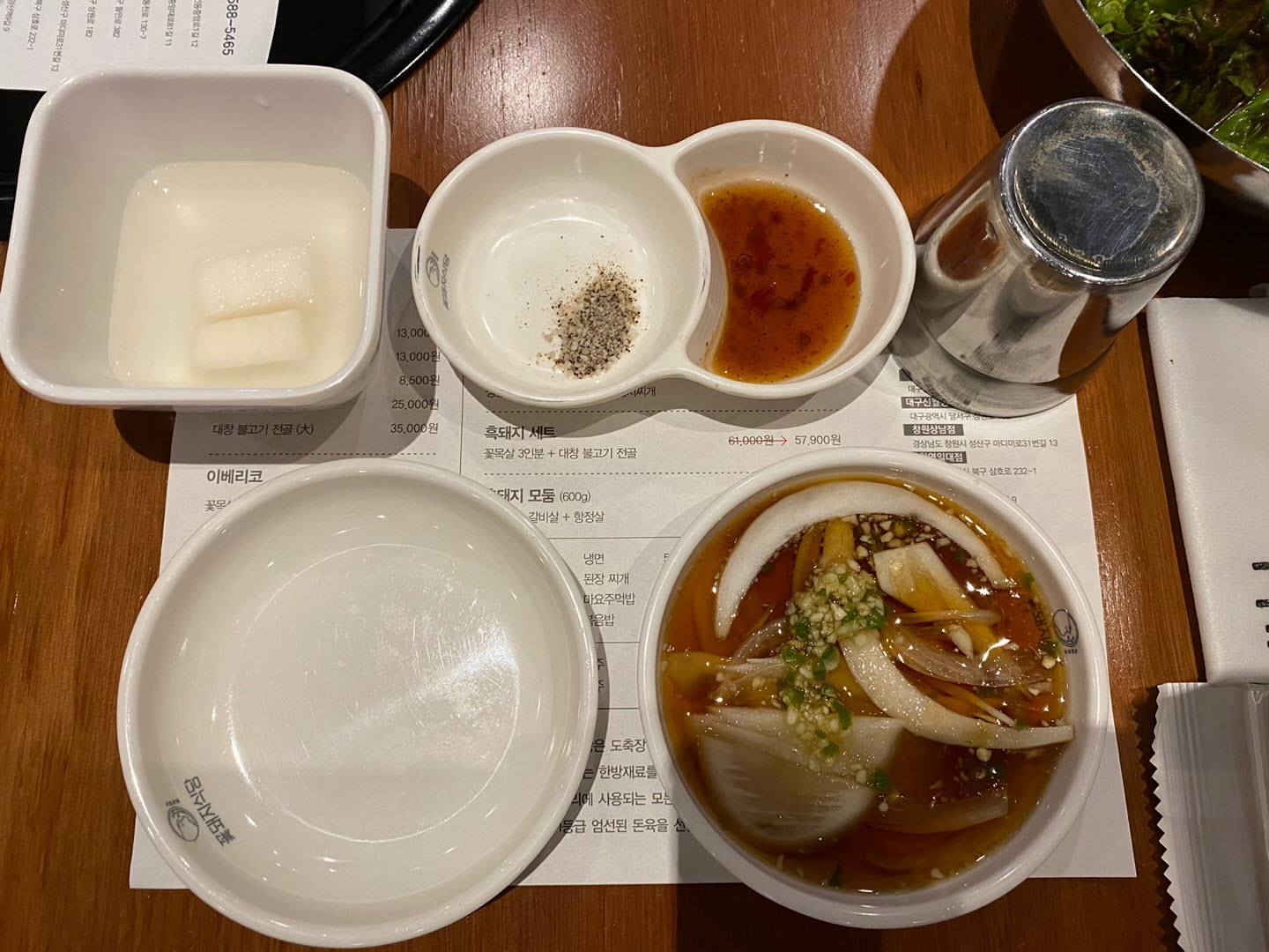몇 가지의 소스류와 한 접시에 담긴 몇 가지 밑반찬들이 전부였지만, 고기와 함께 하기에 좋은 것들로만 간소화된 느낌이어서