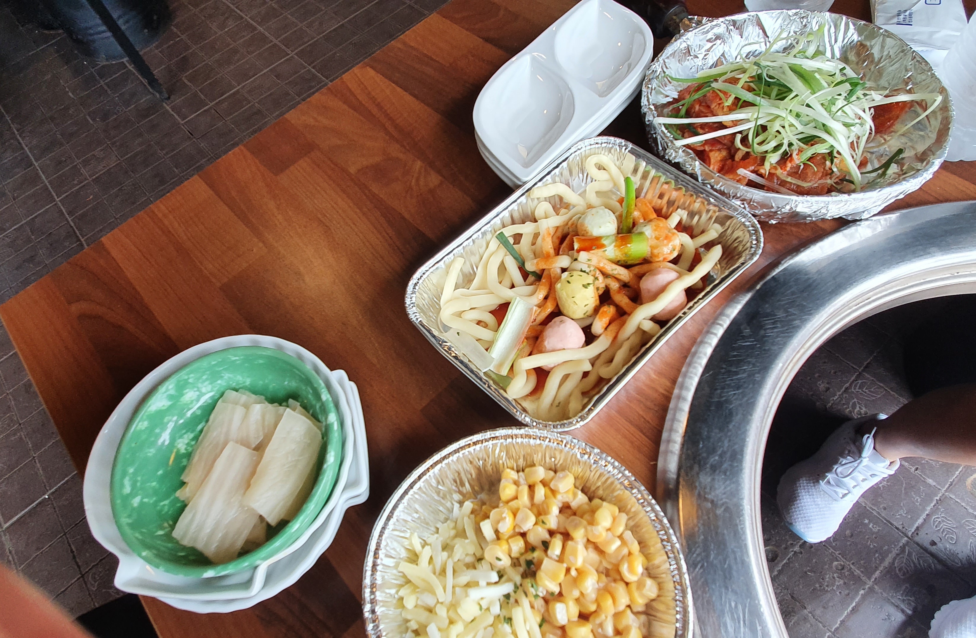 추가적으로 기본으로 나오는 떡볶이와 제육, 콘치즈를 불에 익혀주며 조개찜과 칼국수를 기다렸습니다.