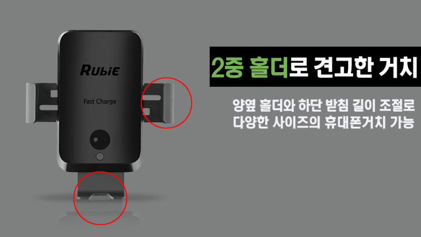 2중 양옆 홀더와 하단 받침 길이 조절로 다양한 사이즈의 휴대폰 거치가 가능하며