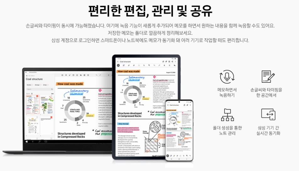 또한 편리한 편집 기능을 제공합니다. 삼성 계정으로 로그인하면 스마트폰이나 PC, 노트북에도 연동이 되어 작업하던 문서를 이어서 작업할 수 있습니다. 디바이스를 바꿔서 작업을 바로 할 수가 있지요. 또한 동시에 손글씨와 타이핑이 가능해져 높은 수준의 멀티태스킹을 지원합니다.