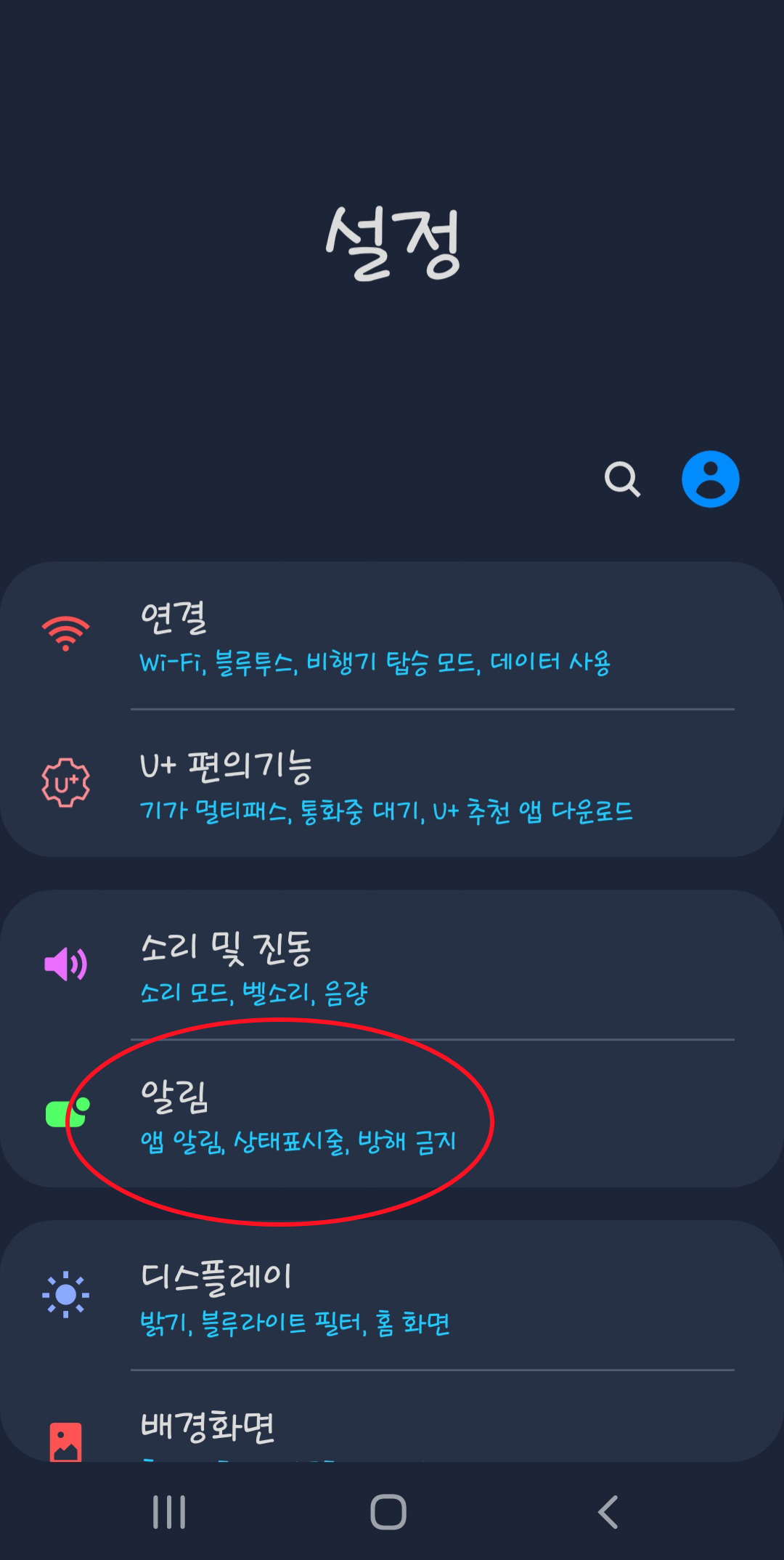 먼저 설정에서 알림으로 들어가 주세요. 문자나 카톡 알림이 오는 알림창을 설정할 수 있는 메뉴입니다.