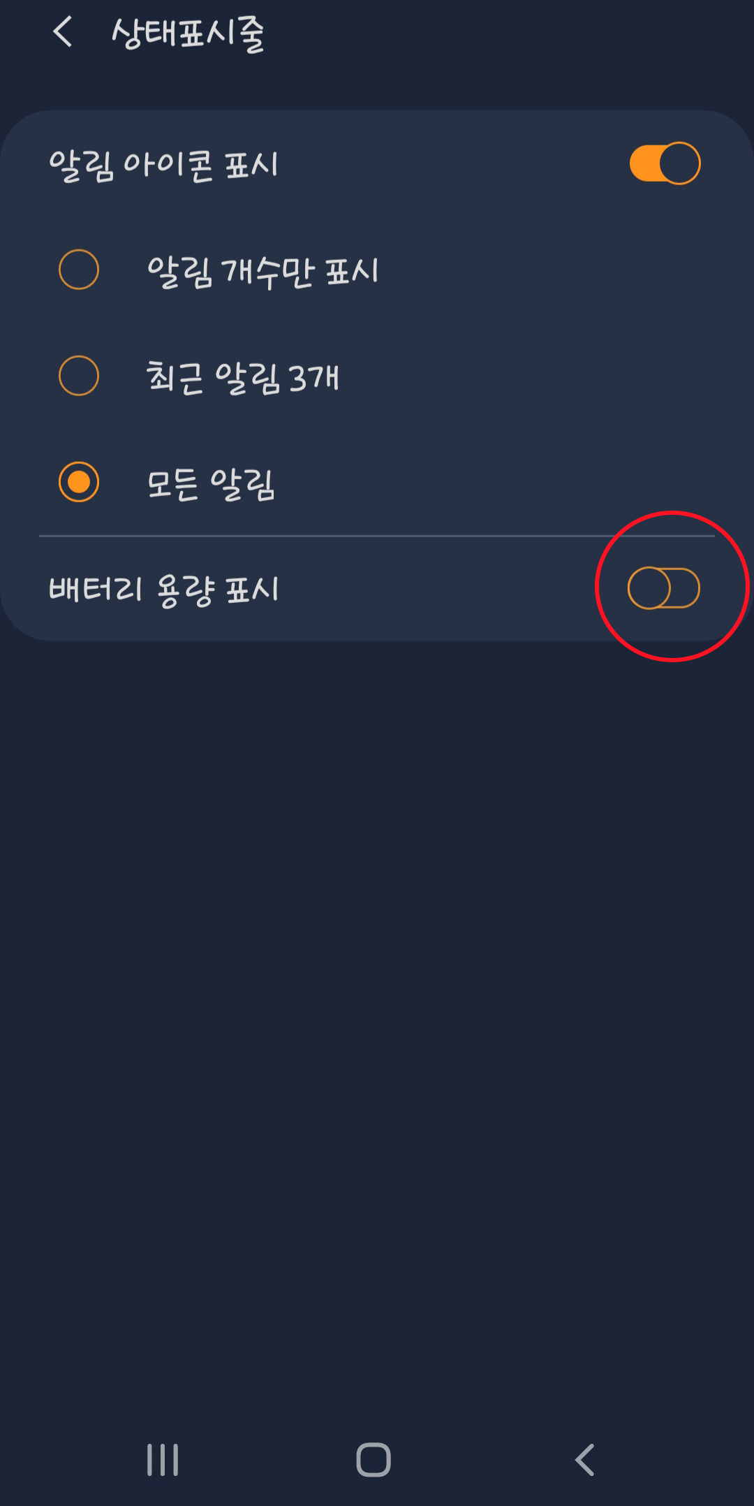 그러면 배터리 용량 표시를 on/off 할 수 있는 기능이 나옵니다. 빨간 부분을 터치해서 표시를 켜주세요. 매우 간단하게 배터리 잔량을 표시할 수 있습니다.