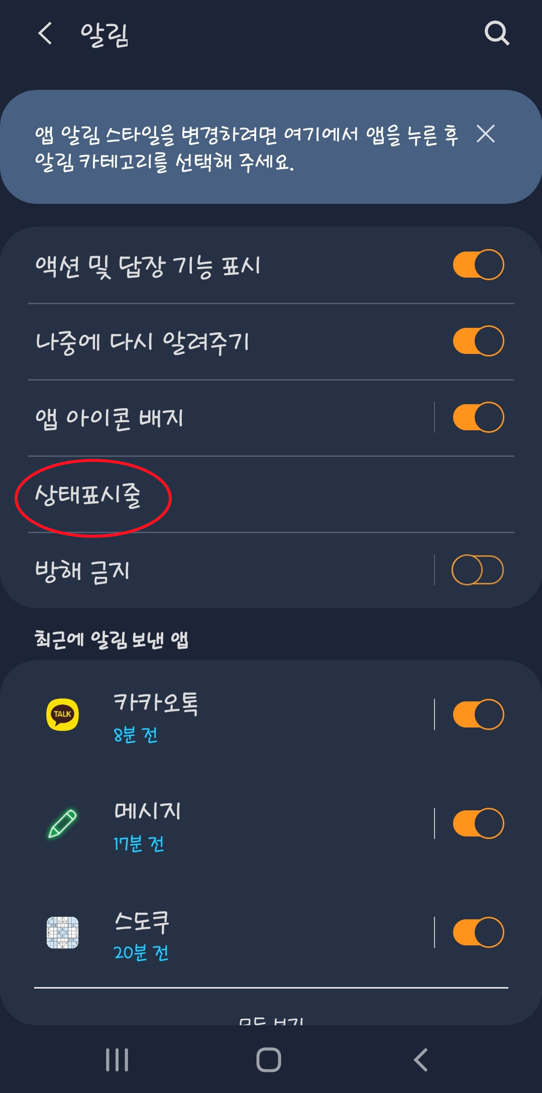 그러면 알림을 설정할 수 있는 목록들이 나열되는데, 그 중에서 상태표시줄을 탭해주세요.
