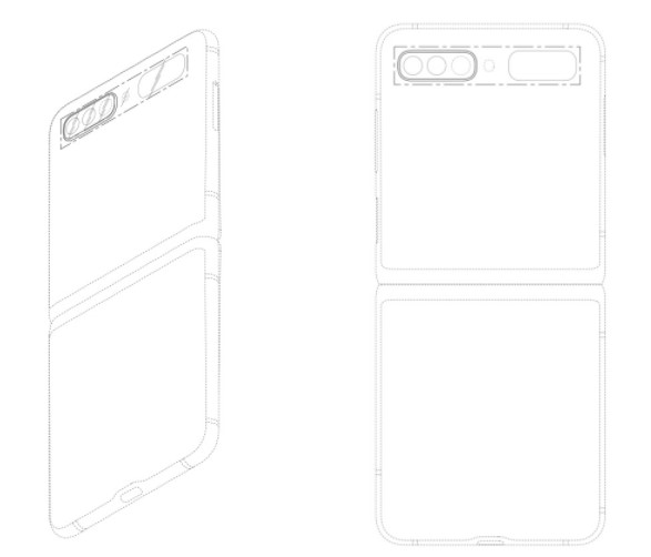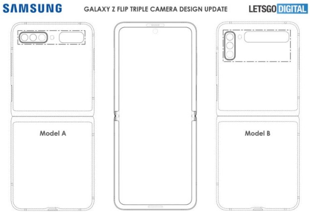 삼성전자는 갤럭시 Z플립 2세대라고 예상되는 두 가지 종류의 디자인 특허를 출원했습니다. 두 가지 모델 모두 트리플 카메라로 구성되어있습니다. 차이점으로는 A 모델은 1세대와 유사한 가로 배열에 카메라 렌즈만 하나 늘어난 모습이며, 외부 디스플레이가 작은 모습을 보여줍니다. (출처: 네덜란드 IT 전문 매체 '레츠고디지털(LetsGoDigital)')