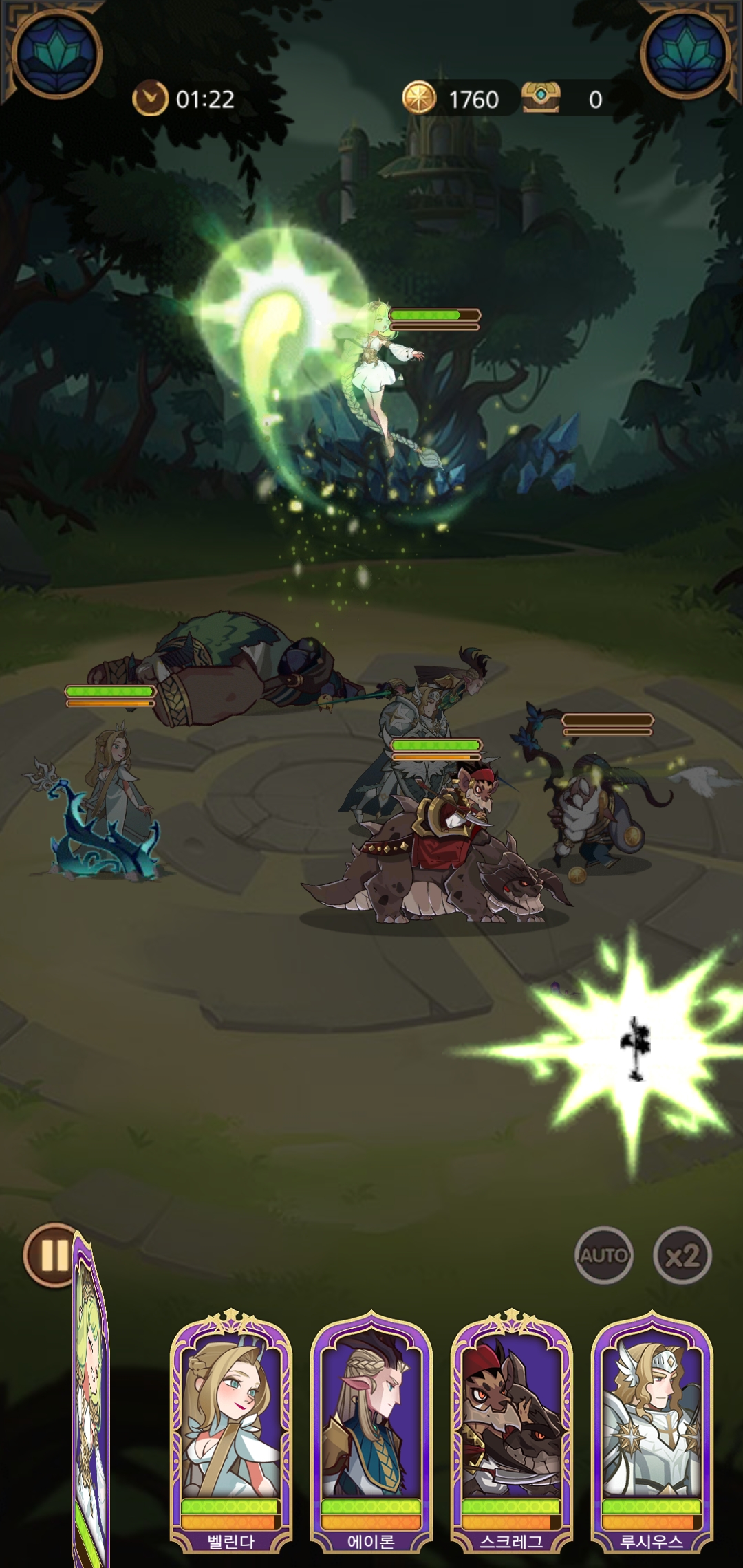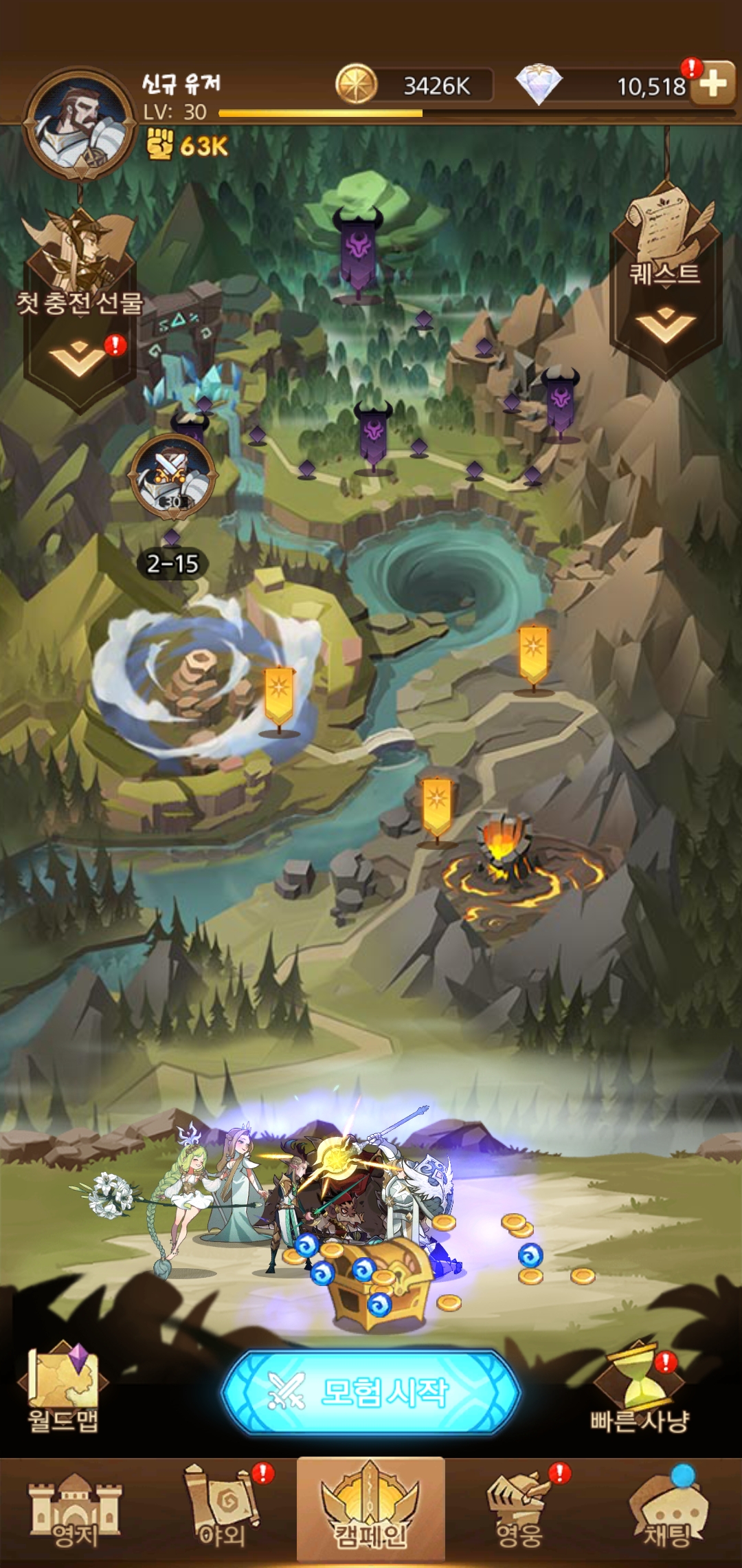 전투는 모험 시작을 누르면 영웅창에서 영웅들을 선택해서 전투를 할 수 있습니다. 따로 조작해주지 않아도 영웅들이 알아서 공격을 하는데요, 유저가 할 일은 영웅들의 필살 게이지가 차면 터치해주는 일만 하면 됩니다. 하지만 그것도 오토가 있어서 자동으로 가능하지요. 정말 귀찮으면 오토로 해결하시면 되겠습니다.