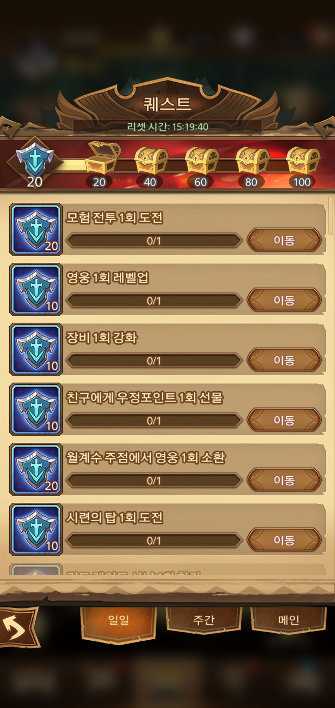 퀘스트 또한 일일, 주간, 메인 퀘스트로 구성되어있습니다. 퀘스트가 독특하게 보통 게임은 12시가 되면 초기화가 되는데, AFK 아레나는 처음 퀘스트 보상을 수령받은 후 24시간 후에 초기화가 됩니다. 저도 처음에 12시에 초기화되는 줄 알고 미리 퀘스트를 했던 적이 있었는데 여러분도 주의하셔야겠습니다.