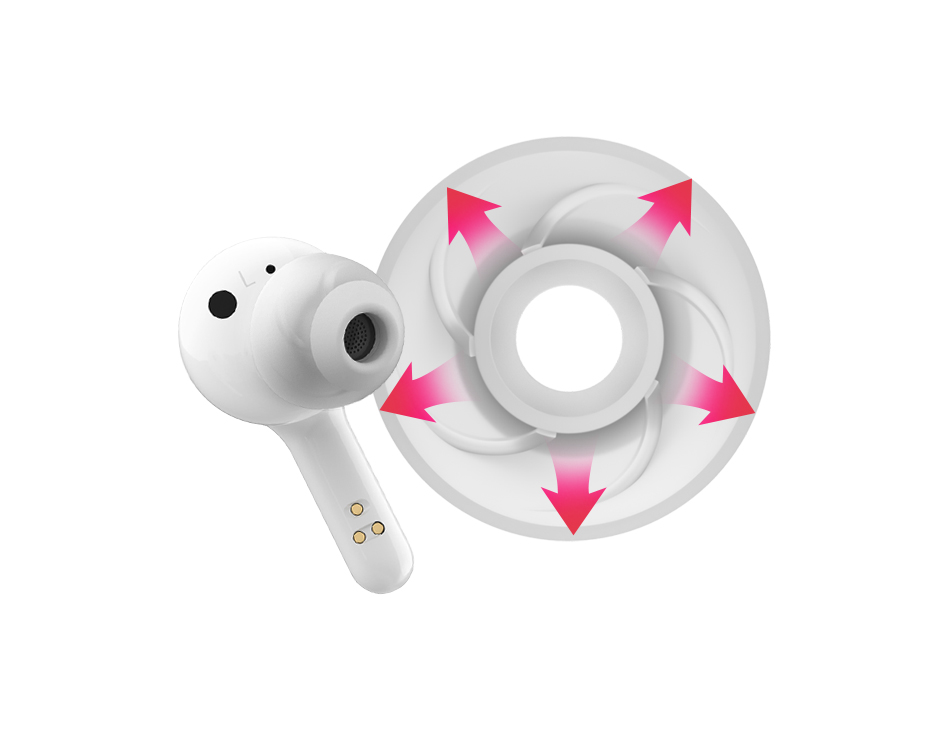 이번 제품은 LG전자가 자체적으로 개발한 '웨이브폼 이어젤'을 새로 적용 했습니다. 이어젤 내부에 나선형 모양을 웨이브를 준 구조를 가졌으며, 착용 시 귀에 전달되는 압력을 전체적으로 압력을 균등하게 분산시켜 귀 모양에 상관 없이 안정적인 착용감을 제공한다고 합니다.