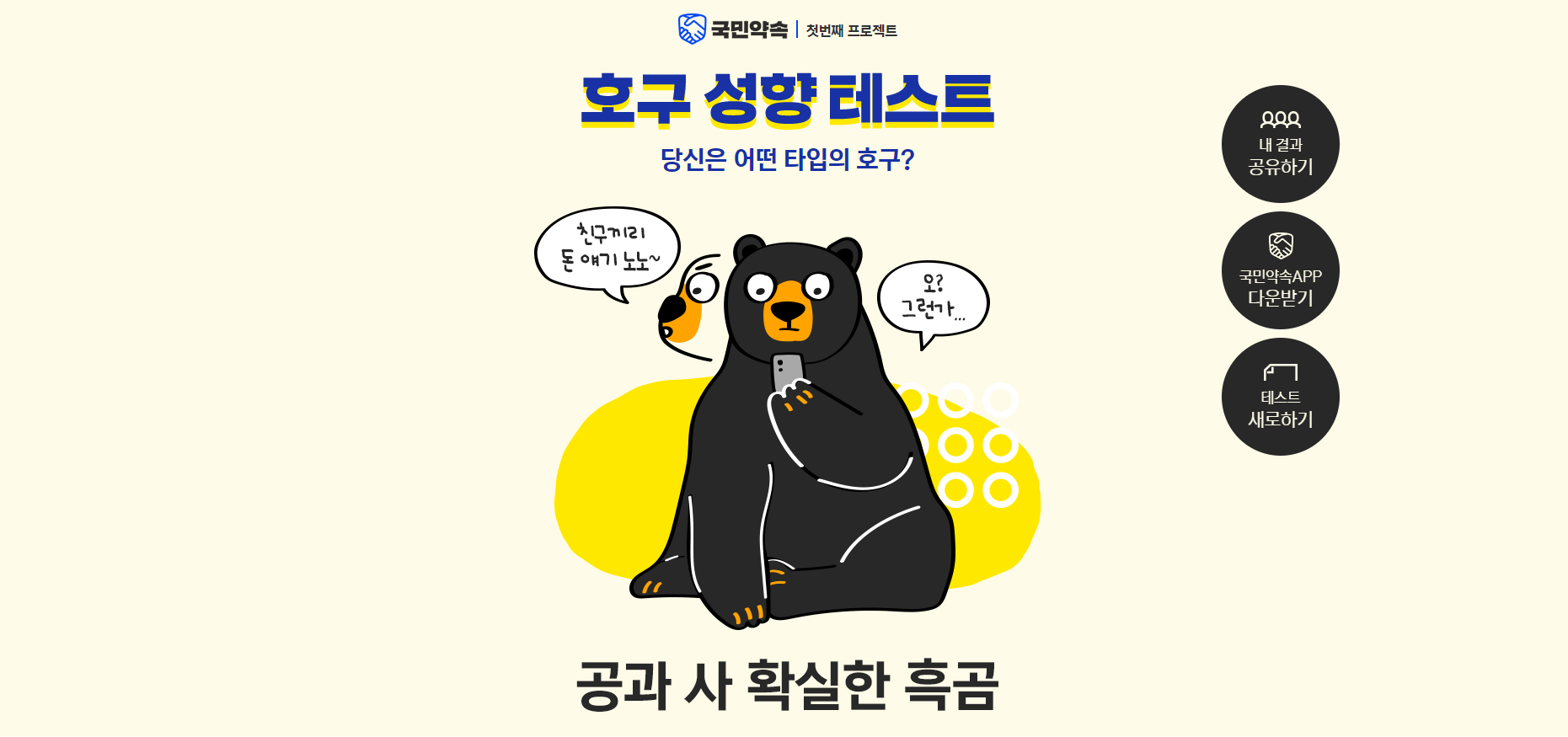 우선적으로 호구 성향 테스트는 모바일 전자계약 서비스 '국민약속' 이라는 업체에서 재미로 보는 내 안에 숨어 있는 호구 성향지수를 검사하는 테스트를 제작 되었습니다.