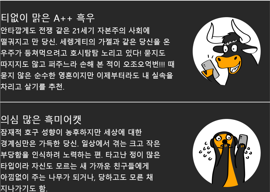 최근 엄청난 인기를 타고 현재 테스트 응시자가 142만명이 되었습니다. 응시자 중 가장 많은 유형은 '티없이 맑은 A++ 흑우' 에 가장 희귀한 유형은 '차가운 도시의 흑염소'로 데이터 값이 나왔네요. 각 캐릭터마다의 특징이 있는데요. 자세한건 바로 아래에서 확인하실 수 있습니다!