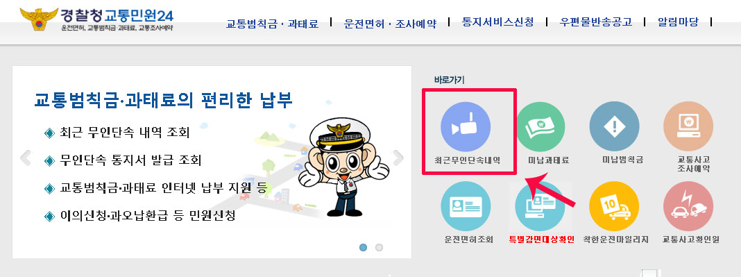 경찰청교통민원24에서는 속도위반 실시간 조회뿐 아니라 미납과태료, 미납범칙금, 특별감면대상확인 등 여러 가지 조회서비스가