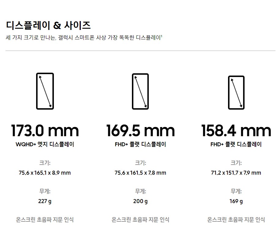 무게는 S21 169g, 플러스 200g, 울트라 227g으로 온스크린 초음파 지문 인식방식으로 출시되었습니다.