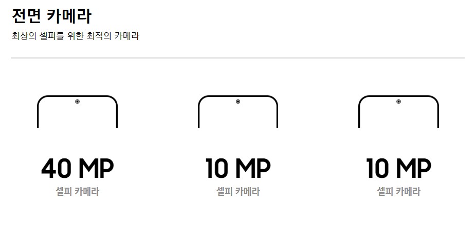 전면 카메라 S21과 플러스는 10MP로 동일하고, S21울트라 40MP로 더 좋은 화질을 보입니다.