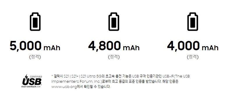 배터리 용량은 S21 4,000mAh, S21플러스 4,800mAh, S21울트라 5,000mAh로