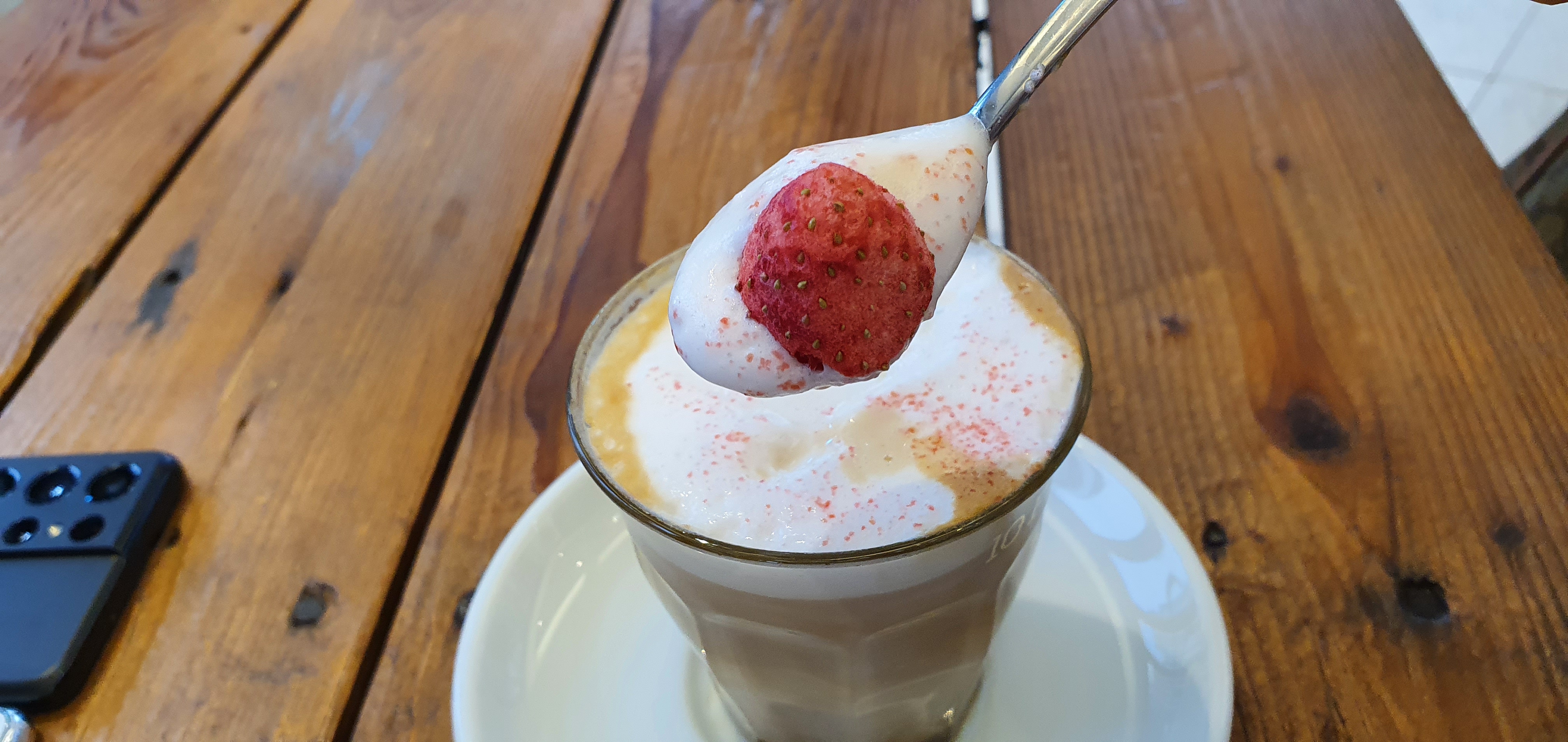 냉동 건조된 딸기를 먼저 먹은 후 숟가락으로 잘 저어준 후 음료를 즐기면 되는데,