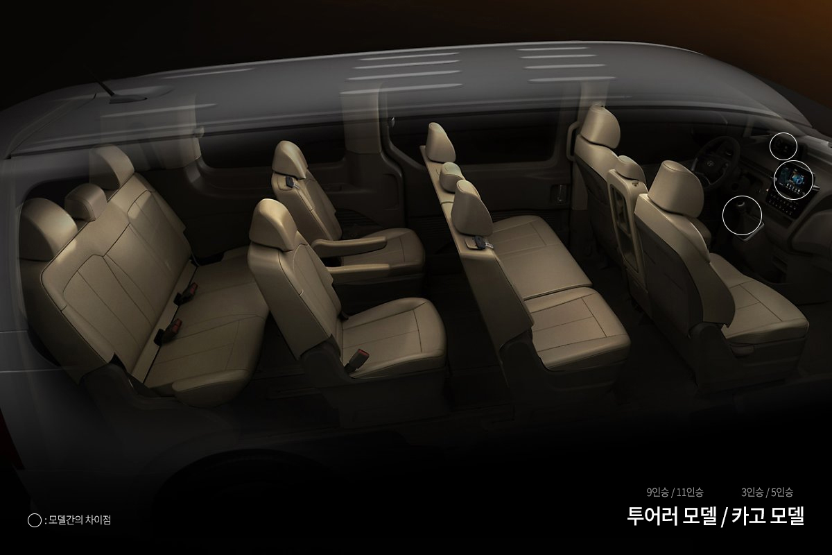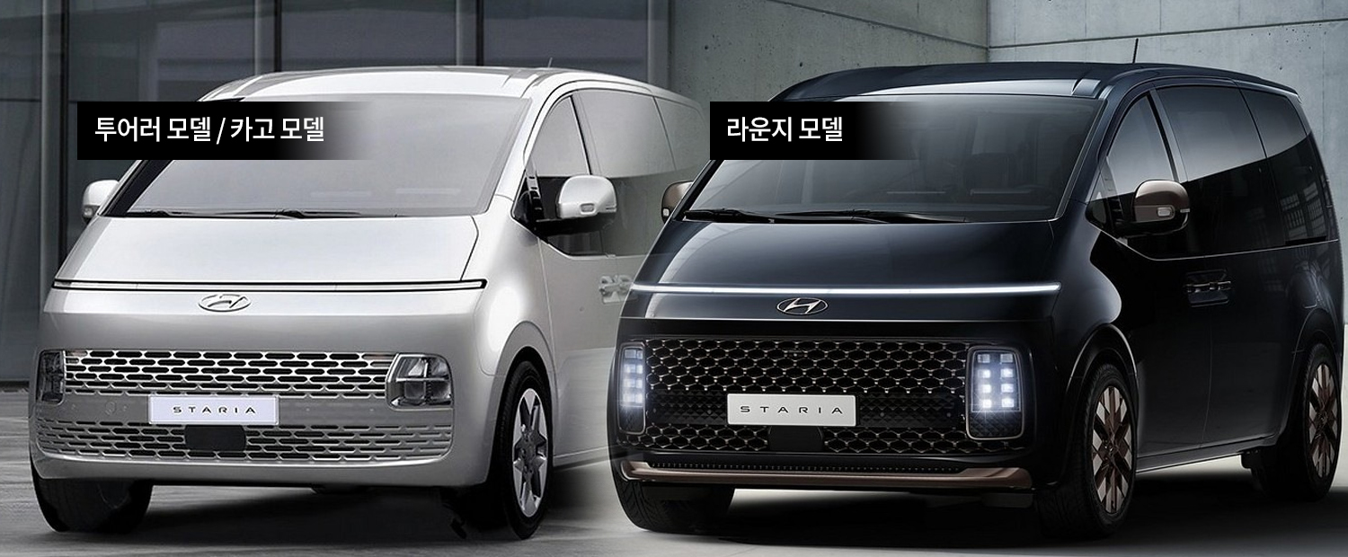 스타리아의 종류는 9인승과 11인승으로 승객을 태울 수 있는 '투어러' 모델과 많은 짐을 실을 수 있는 화물류인 3인승과 5인승 '카고' 모델, 적은 승객을 태우나 넓고 쾌적하게 이용할 수 있는 7인승과 9인승으로 이뤄진 '라운지' 모델로 출시 한다고 합니다.