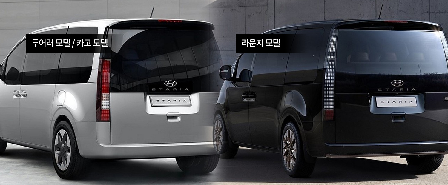 후면부도 각 모델간의 디자인 차이가 존재합니다. 라운지 모델의 경우 뒷 리어 램프가 수직으로 길게 뻗어진 모양을 띄고 있으며, LED 타입으로 캐딜락 사의 에스컬레이드 차량가 떠오르게 하네요. 투어러와 카고 모델은 기존과 같이 일반 램프로 디자인 되었으며, 휠 디자인도 라운지는 투톤으로, 투어러와 카고모델은 원톤으로 디자인 됐습니다.